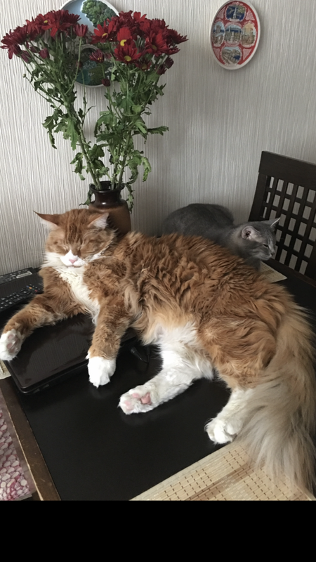 А ещё он с дворянкой, которая весом дай бог 2 кг, постоянно лежат вместе, вылизывают друг друга до скрипа. Дворяночка даже иногда блюет его шерстью)