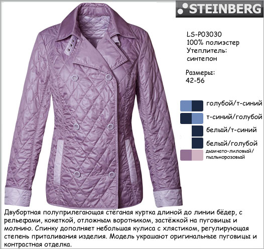 Австрийская фирма Штайнберг. Стеганная курточка на небольшом утеплении. Очень симпотичная. Цвет голубой с синим, на картинке внизу есть такой цвет. Мне таже на параметры 110-99-122 село нормально, в груди без запаса на кофту, т.е. пододеть свитер под эту куртку я не смогу, будет тянуть в груди, но там можно перенести верхнюю пуговицу и будет окей. сзади хлястик с помощью которой можно сформировать талию:)))) Мне опять же таки широки в плечах и поэтому некрасиво смотрится.