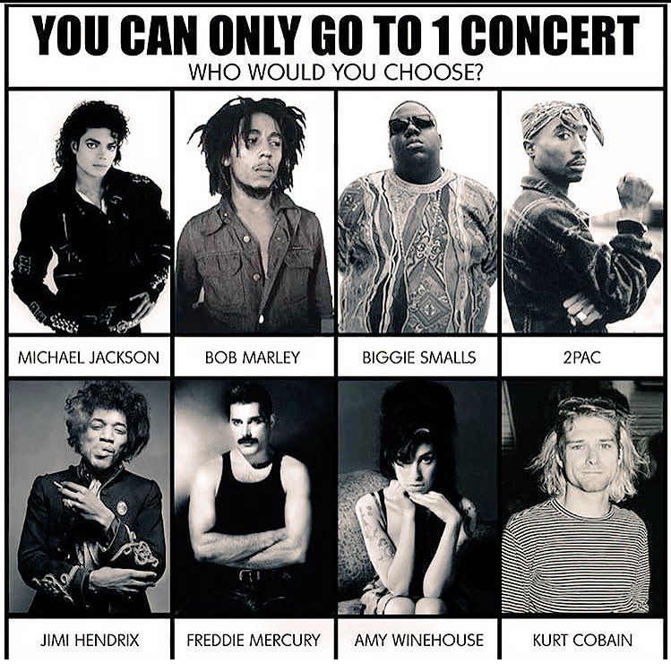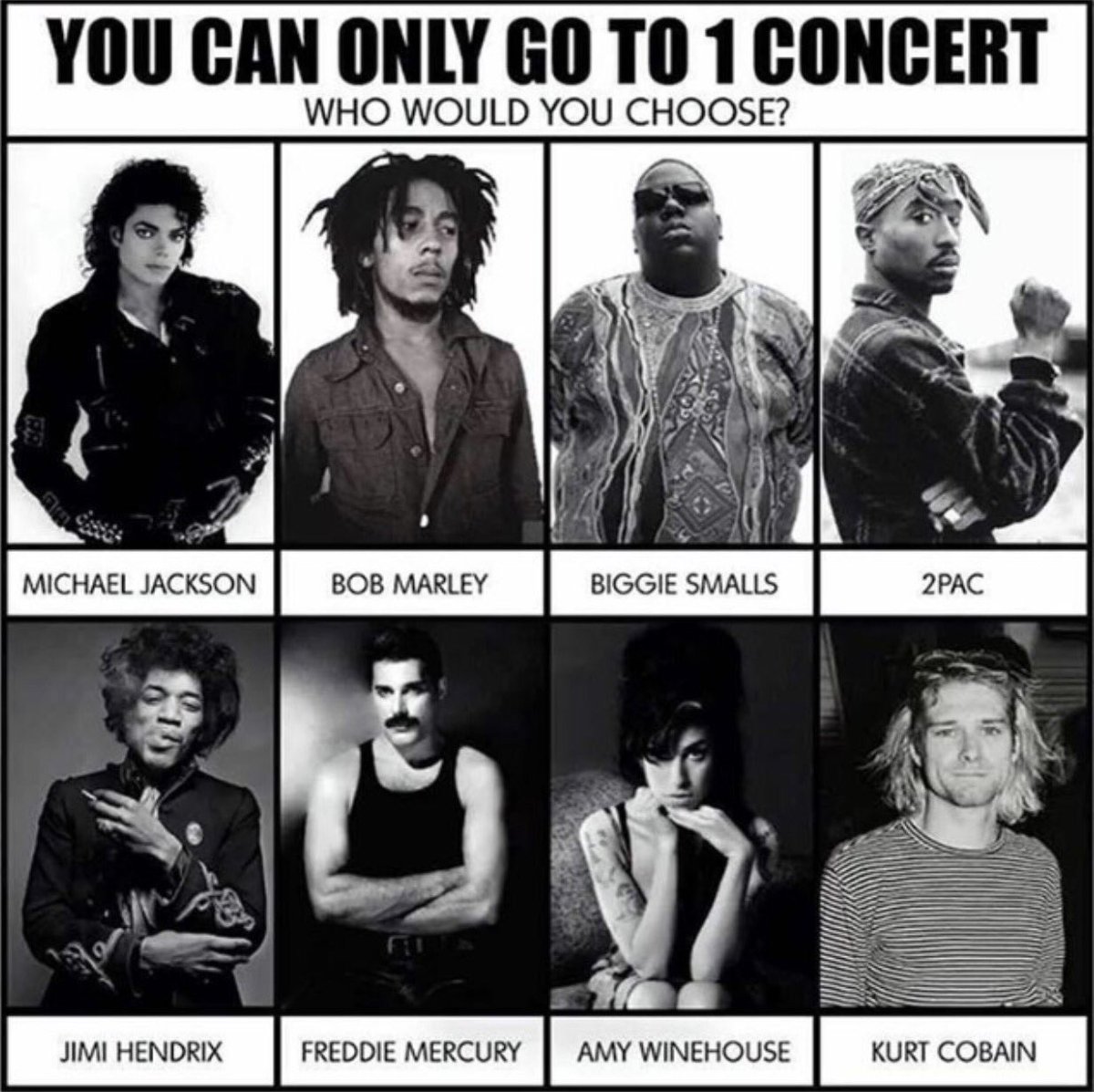 А можно три раза на Меркьюри? Нельзя.... Тогда Меркьюри, Боб Марли, Эми. И всё-таки , я бы три раза сходила на Фредди