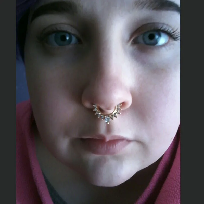 Дочка в 16 лет попросила септум проколоть. Мода такая. Ей нравится, что нос визуально тоньше выглядит. Ну и просто это украшение.