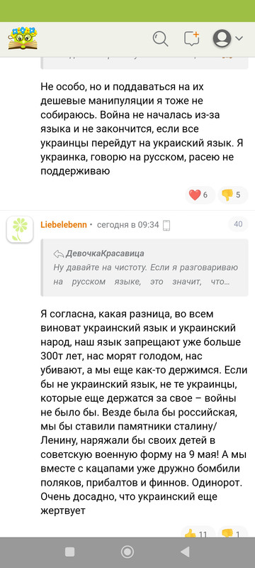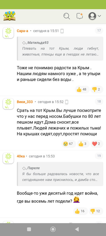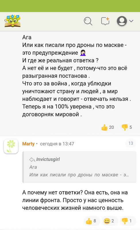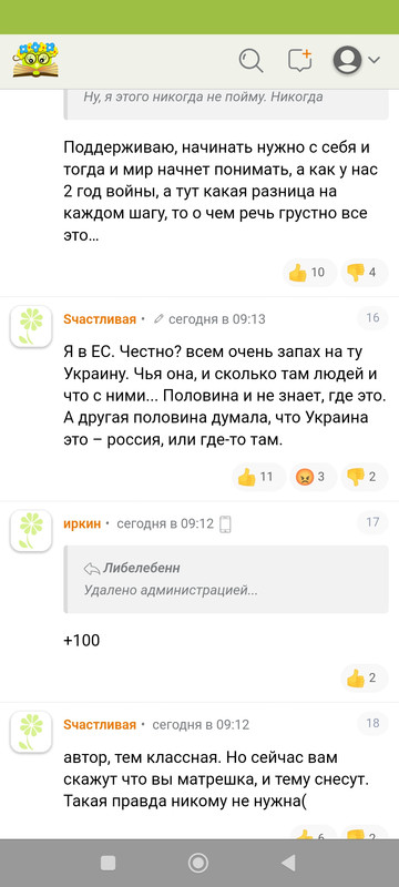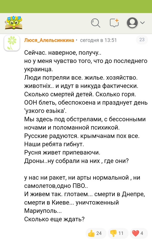 Прочитала топик на КС на 15 страниц про обстрелы Шебекино. Блин, на 97% радуются. Бумеранг и тп. Пару человек написало что сочувствуют мирным. Поразило, что вообще не задаются вопросом какого фига обстреливают мирных. Я,