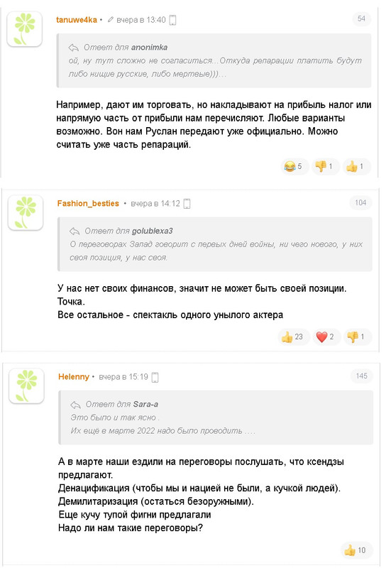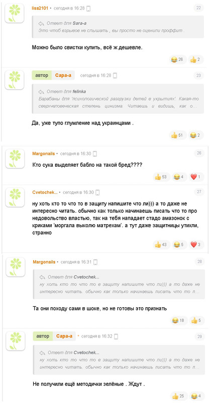 - заявления от официальных лиц(!!!) палаты № 6, об изнасилованиях чайными ложечками, воровстве микроволновок и стиралок российскими военными, и прочем, что они там несли, но все примерно в эту степь,