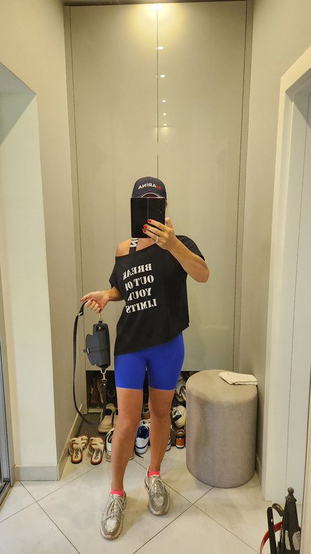 Я на тренировку надеваю топ типа такого Эко топ спортивный, NEBBIA https://www.wildberries.ru/catalog/154776742/detail.aspx. Он отлично держит грудь. Но сверху обязательно футболку или майку.Футболка оверсайз черная с принтом, Profit_wear https://www.wildberries.ru/catalog/14895044/detail.aspx Так и заниматься комфортно, и доехать в машине удобно. Ехать мне три минуты, фото сделала уже выбегая. Поэтому и сумка, куда ж без нее.