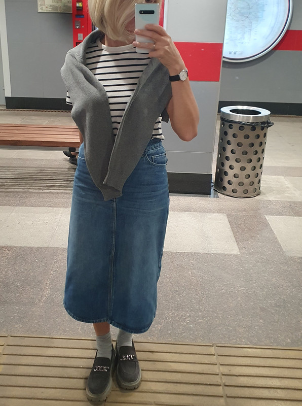 Нравится сочетание цветов: триколор. Люблю такое. Кофта очень милая. В волнистую полосочку. И красные лоферы. В юппках не люблю такую длину. Я ее называю: ни два, ни полтора)