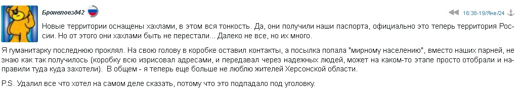 Ничего нового в принципе, все как всегда. Как только начинаются обсуждения, об нищете, пенсиях, смерт*ях их мужиков. Тут же постится пост о насилии бурятами очередного "котика" в плену, воровстве нами их Гагарина, и перспективами быть изнасилованными а затем угнанными в Сибирь в случае переговоров. И их несет..Я называю такие посты "пятиминутка ненависти" Но правда, появилось нововведение, темы перемох- это как правило бои неуловимых пэтритов и Ф16, которые пачками сбивают наши миги и сушки. Ну и обычные, где выше пособие? как долететь в Россию и не попасться в Шереметьево ФСБшнику? Как выйти замуж за европейца? и какие уроды США и Европа что заставили разоружиться Украину