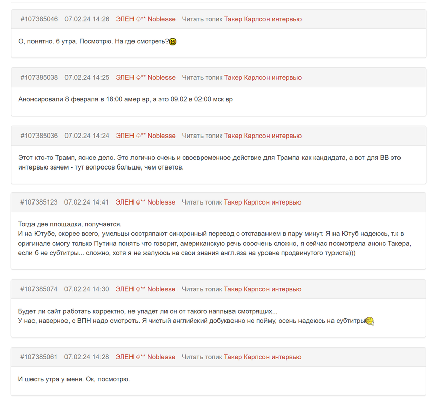 Тоже думаю что взял уже. Вчера ж его машину засекли якобы где то выезжающим от Путина. Я только не очень понимаю ажиотажа раздутого - ну интервью, ничего для нас нового Путин не скажет, сто раз везде уже это говорил, ну выложит Карлсон где то в соцсетях, ну посмотрит какой то миллион другой американцев, ну даже если половина из них задумается… другая половина скажет как и привыкла - кремлевская пропаганда все это… дальше то что? Ничего не изменится ни в мире, ни в политике, ни в отношении к России и русским.. инфошум, не более.