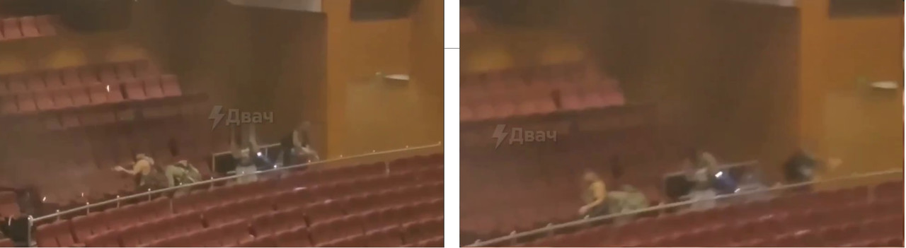 В зале у сцены, в камуфляже - просто Рембо. В фойе - высокий крепкий мужчина в светлых брюках и чёрной бейсболке, левее - здоровый мужик с русыми или рыжими волосами(видео со спины и не очень видно детали). Но общий план видно, крепкие физически и высокие мужчины.
