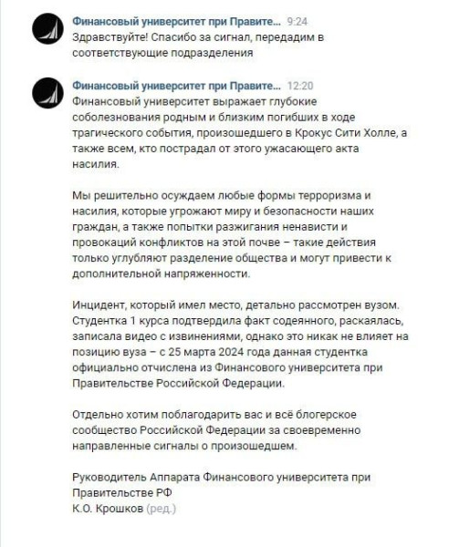 Студентку, которая цинично высказалась о трагедии в Крокусе отчислили из универа.