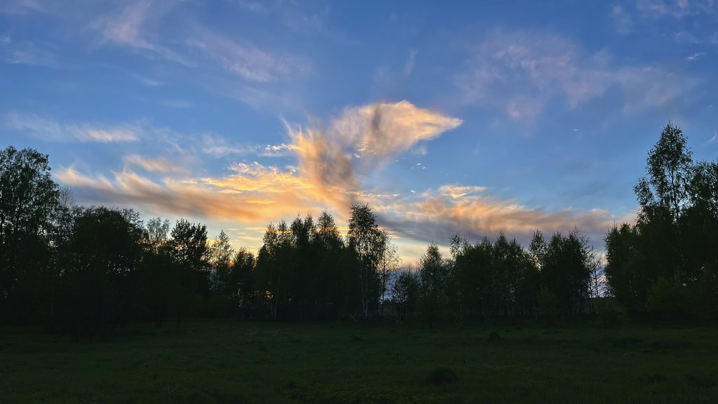 Я вчера возвращалась в 19:30. Небо на северо-востоке было пасмурным, и я не не пошла на свою ежевечернюю прогулку. Может быть, позже тучи развеялись. У меня окна на восток, и заката я не вижу.