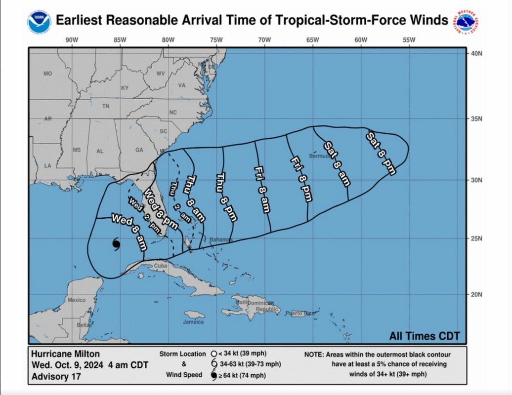 Шкала Саффира — Симпсона предусматривает порывы ветра скоростью до 70 метров в секунду, но 7 октября скорость порывов «Милтона» доходила до 80 м/с.