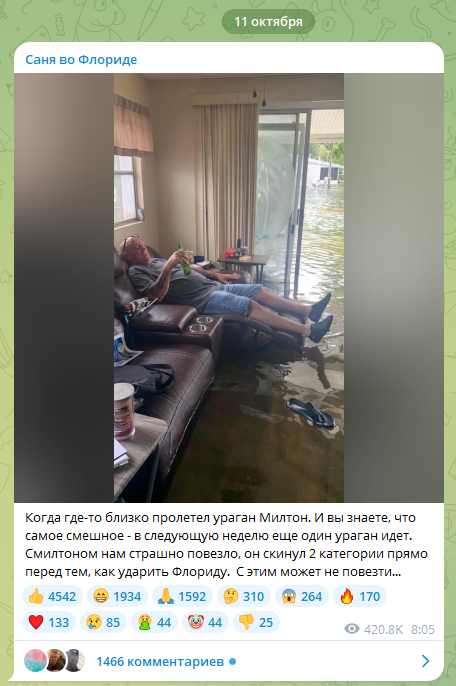 Алена-блогер-Америка написала, что в ураганах Путин виноват. Типа война на украине - европа опять топит углем - на земле стало теплее - ураганы сильнее. И тут же пишет, что сезон ураганов у них до октября (на самом деле до ноября). Про ураган Катрину забыла, видно.