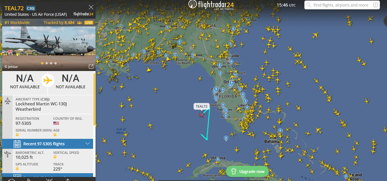 Там мотылялся WC-130J «Weatherbird» — это модульная версия самолёта C-130J, оснащённая специализированными системами для проникновения в тропические и зимние штормы, сбора метеорологических данных и помощи в прогнозировании погоды.
