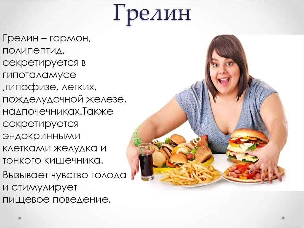 Контроль аппетита и энергетического баланса. Гормон стимулирует увеличение аппетита и чувство голода, а также уменьшение потребления энергии.