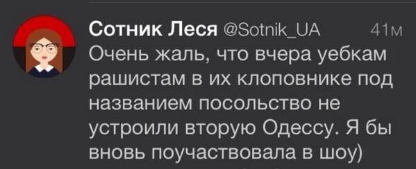 Теперь я могу с уверенностью сказать, что к данной акции причастнен давний агент разведки Госдепа бывший министр иностранных дел Огрызко, под крышей которого находились как КУПР, так и "Студенческое братство" (которое возглавлял Юсов - ныне депутат Одесского совета, причастный к Одесской Хатыни). Кстати, он неосторожно несколько часов назад всплыл во время трансляции ГромадТВ, радостно комментируя погром посольства РФ, что теоретически - любое нападение на дипломатическое представительство или дипломатов - это плохо и натизаконно, но в данном случае он людей, хе-хе, прекрасно понимает и поддерживает их не спровоцированный и праведный гнев...