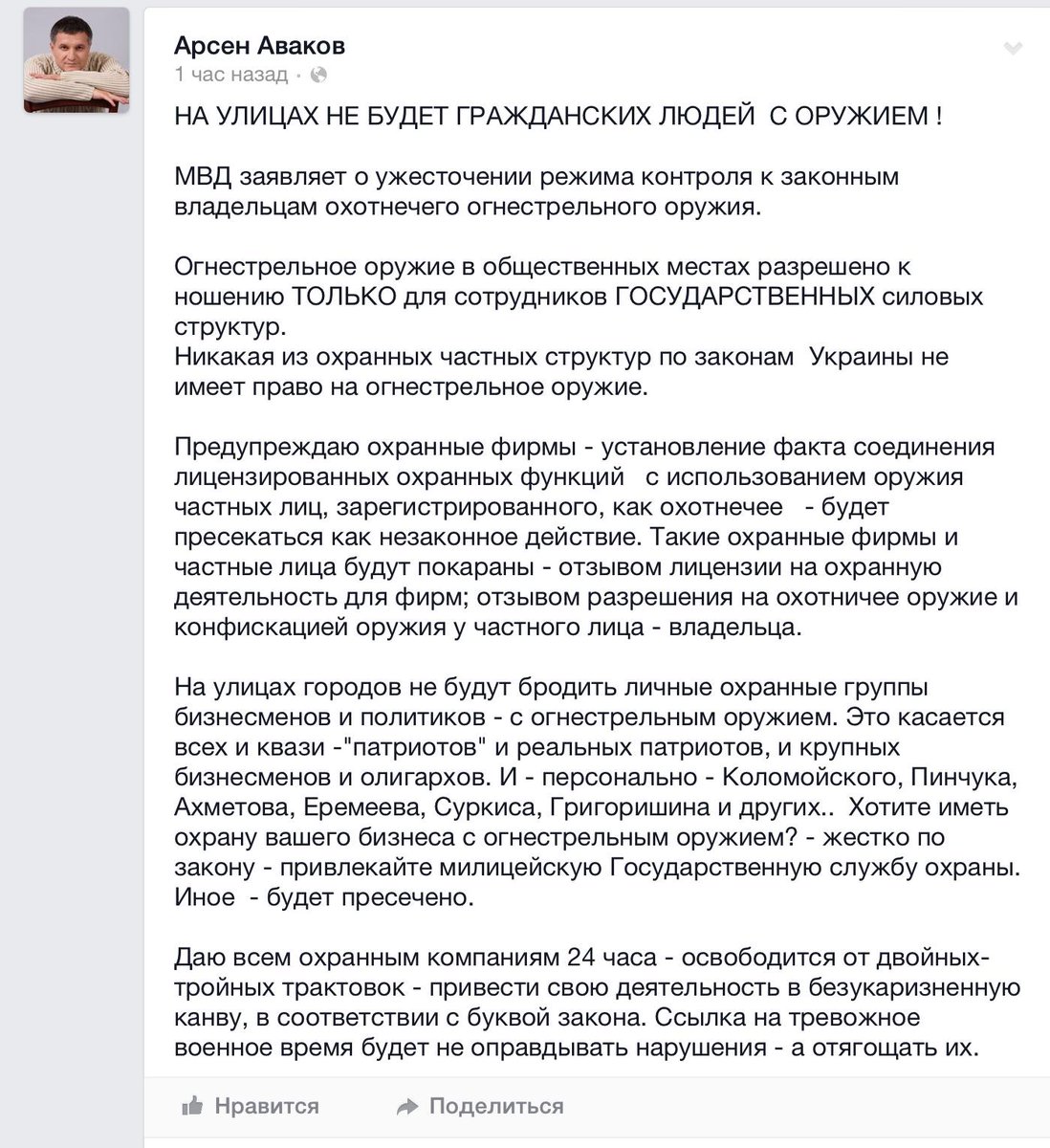 «И в ближайшее время — есть уже четкие указания и президента, и, я так понимаю, генеральный прокурор будет контролировать, чтобы, во-первых, каждый человек, причастный к нахождению в «Укрнафте», должен быть разоружен, если и были разрешения – они должны быть отменены», — считает Наливайченко.