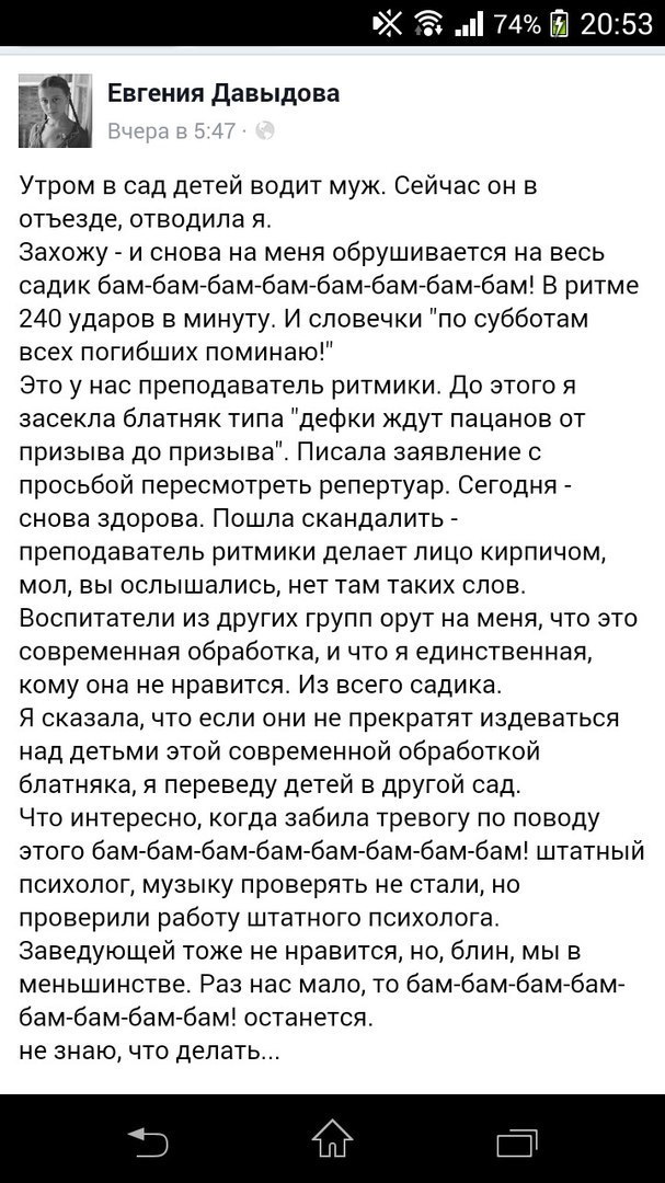 "... ведь у нас такой огромный выбор патриотических песен, вот товарищи их много приводили на стене, простите, что стерла всё, хотелось упорядочить пространство. Нет, ей, преподавателю фитнеса, не нравится Лещенко и Кобзон, не нравится гимн РФ, не нравятся песни времен ВОВ. Она настаивает, что на занятиях должна звучать электронщина без мелодии с довольно низкосортным текстом. По крайней мере именно за неё она так яростно сражалась с методистом."(с) по ссылке еще много текста https://vk.com/id37877611