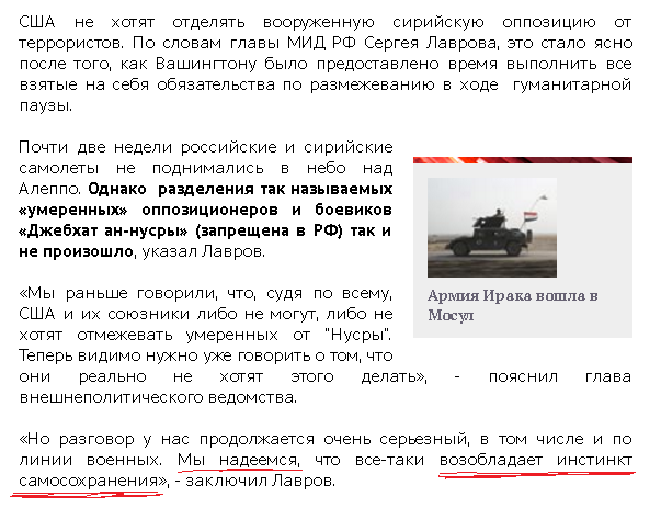 «Обсуждение между российскими и американскими представителями в последние дни в основном вращалось вокруг вопроса о «Джебхат ан-Нусре», на которую никогда не распространялось никакое перемирие. О том, что это за группировка, кто за ней стоит, кто к ней примыкает. Почему в условиях, когда все вроде бы признают, что речь идет о террористической организации, напрямую связанной с «Аль-Каидой», которая 15 лет назад совершила страшные теракты в США, администрация Барака Обамы не спешит отделять от нее антиправительственные отряды, ориентированные на Вашингтон», - говорится в сообщении.