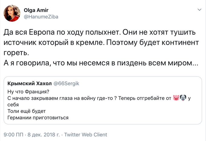 Французы все же непроходимые идиоты. Сначала им технично убрали вменяемого кандидата и подсунули Макрона. Когда им говорили, что ими манипулируют, они пели 'Марсельезу', что Фийон запятнался в коррупции. Где тогда были 'жёлтые жилеты'? Вы выбрали себе Макрона, кушайте и не обляпайтесь.