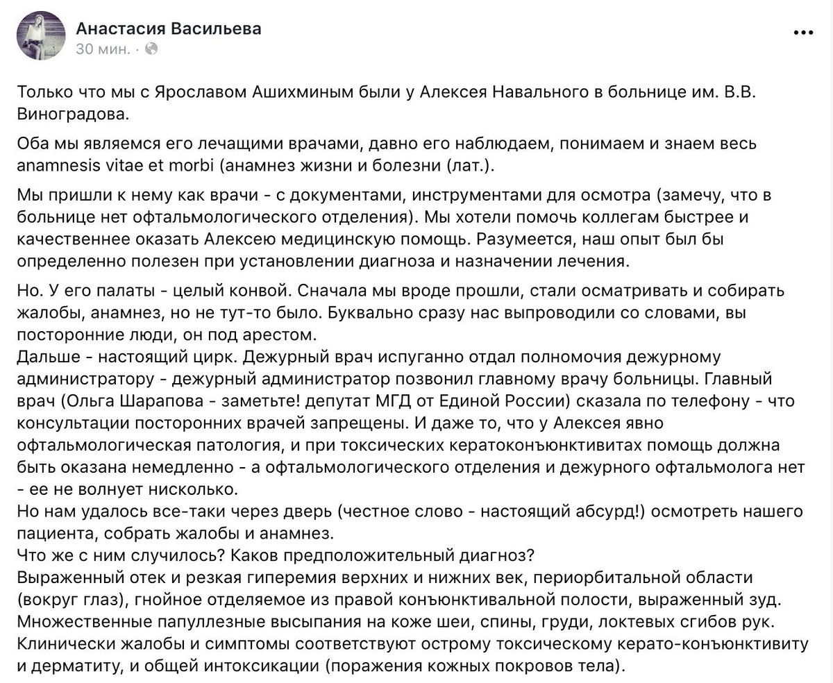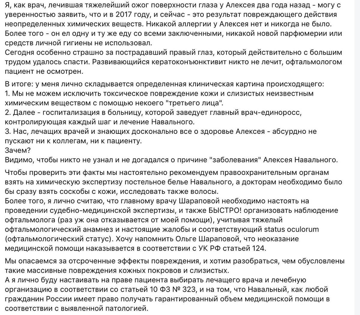 Офтальмолог Анастасия Васильева, которая лечила Навального после химического ожога глаза, по итогам сегодняшнего осмотра (без анализов и чисто «на глаз») пишет, что его состояние — следствие воздействия химических веществ.