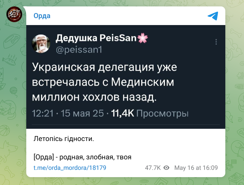 Мы рассматриваем эти переговоры как продолжение мирного процесса, прерванного в 2022 году — Мединский