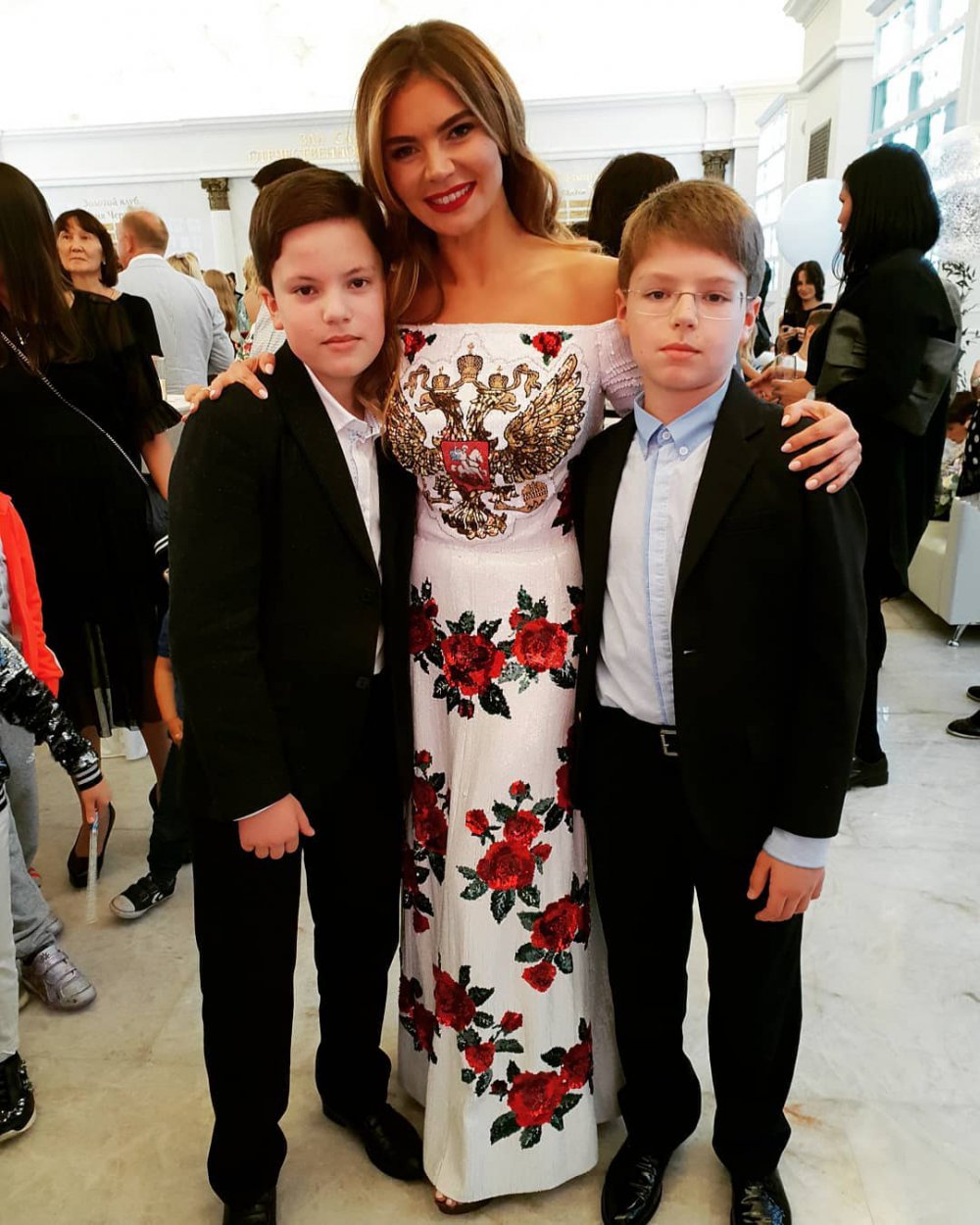 Так, на открытии фестиваля художественной гимнастики "Алина" Кабаева появилась в белом платье с открытыми плечами, расшитом красными цветами. На груди "тайной первой леди" красовался российский двуглавый орел - государственный герб России.