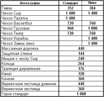 К любому СК - стандарт или люкс в комплекте идет горка (в полной комплектации), а также можно подобрать соответствующие аксессуары, в т.ч. гамаки и пр.
