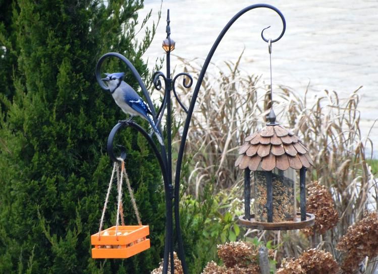 А это Blue Jay (Голубая сойка) прилетел за своей порцией арахиса с скорлупе. Удивительно, что он умудряется за один раз захватить аж 2 арахиса: один заталкивает себе в горло, а другой в клюв и летит на верхушку дерева, где уже будет выковыривать орешки.
