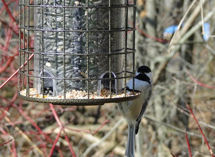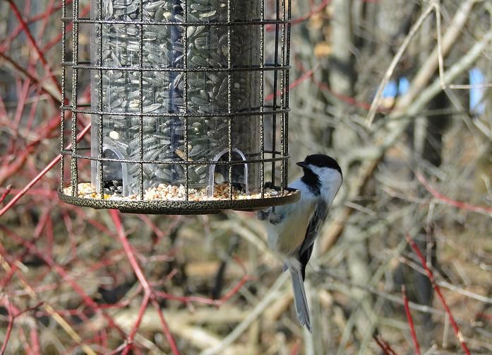 Сегодня была чудная погода, тепло и солнечно. Поэтому я большую часть дня была на улице. Сделала несколько фотографий. Смотрите на моих Black-capped Chickadee (Черношапочная гаичка), их сейчас видимо-невидимо. Это наш, северомаериканский вариант синички. Кстати, я теперь знаю почему их так называют. Когда она подлетает к кормушке, она издает звуки : "чика-ди-ди-ди-дииииии". Семечки они тоже не глотают сразу, а схатив одно семечко, усаживаются на ветку и, придерживая его лапкой, аккуратненько расщепляют и достают зернышко. Так целая стайкa и сидит на дереве, каждая со своим семечком.