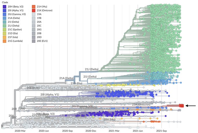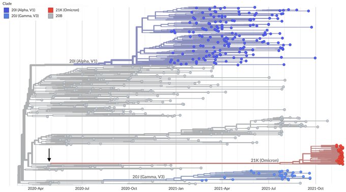 «21K (Omicron)», показанное здесь красным. Они не происходят от ранее идентифицированных «вариантных» вирусов, а их ближайшая эволюционная связь связана с вирусами середины 2020 года.