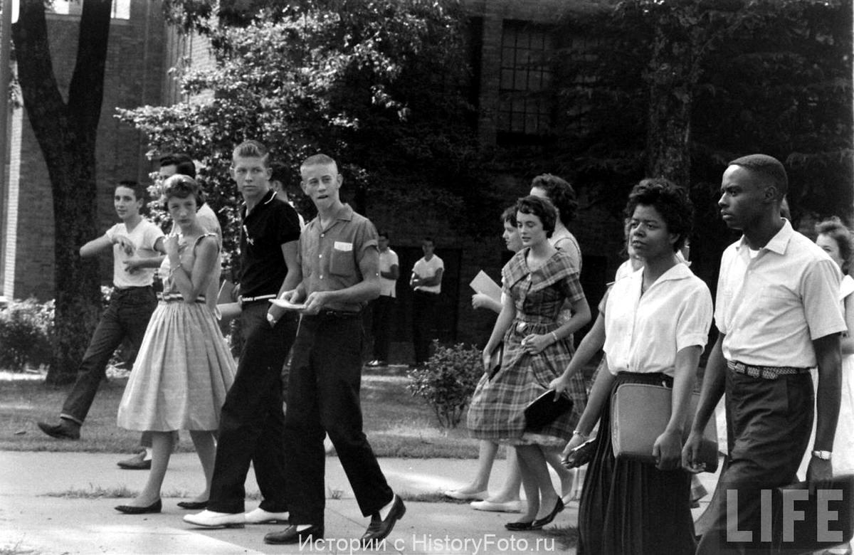 Белые учащиеся издеваются и третируют черных, взирая на них с презрением и насмешками прямо посреди улицы в Литл-Роке по дороге в школу, штат Арканзас. Журнал LIFE, 1957 год