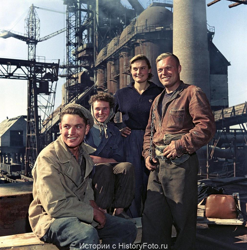 Передовые строители доменной печи «Ждановская-комсомольская». Комсомольцы-ударники «Металлургического завода им. Ильича» в Жданове, 1958
