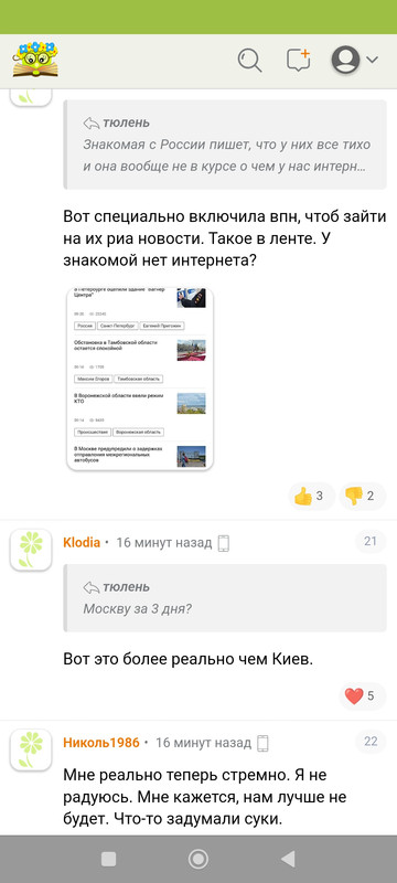 Кстати, вчера в 9 вечера брат с семьёй выехали из Анапы на машине. Сейчас созванивались, проезжают Миллерово, едут по плАткам. От меня узнал все последние сплетни в стране. Никаких колонн не видел в районе Ростова.