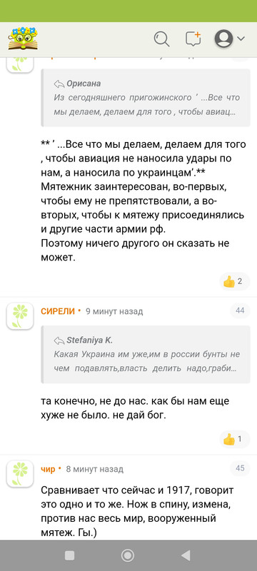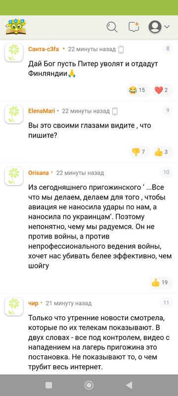 Сейчас общались с другом из Воронежа, он говорит, что видео в сети с покушением на вертолёт снял его друг. Ракета, которая в итоге в вертолёт не попала, и стала причиной возгорания на нефтебазе. Говорит, что на улице слышно сплошной мат, все возмущаются, никто Пригожина не поддерживает