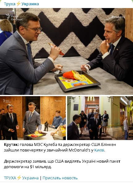 Телеканал отмечает, что поездка госсекретаря США в Киев проходит на фоне того, как контрнаступление ВСУ продвигается намного медленнее, чем ожидалось ранее. Блинкен «ожидает отчета» от 3еленского.