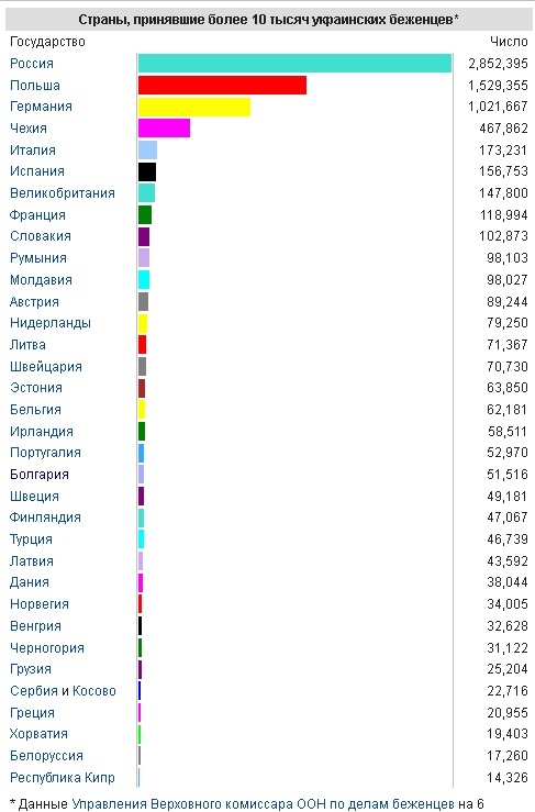 Посмотрим на статистику беженцев с Украины, которых приняли страны в течение 1 года (в таблице данные Управления Верховного комиссара ООН по делам беженцев на 6 декабря 2022 года)