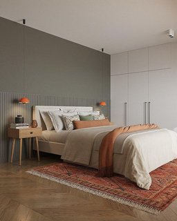 а еще нужно придумать, как визуально маленькую квадратную спальню. увеличить. Все стены в квартире будут под покраску единым цветом - серо-бежевый или миндальный или бежевый, ненавязчивый молдинг (под вопросом). Ничего лучше не придумала, как за изголовьем кровати фотообои или фреску в темных расцветках сделать. Какую то объемную, погружаующую картинку