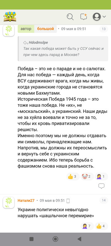 Почитала немного украинцев. Не хотят никаких переговоров БЕЗ перемирия. Типа это не переговоры, а капитуляция. Здравая девушка из Киева пыталась им там доказать что лучше переговоры, чем отсутствие переговоров, при чем тут капитуляция - заклеймили что из россии она.