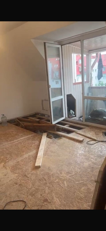 Пол - проложили ленту от живности, новую основу - цементный композит.