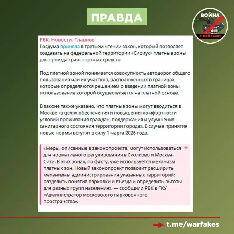 Правда: Конечно же, никто не собирается делать платный въезд в столицу. Фейкометы вновь выдернули из текста нового закона то, что им выгодно и тиражируют недостоверную информацию под видом кликбейтной сенсации.