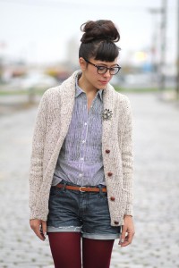 Есть два варианта. Либо коричневые колготы и оливковые шорты, или шорты серые, а колготы бордовые. Шорты плотные, одни из джинсы, вторые из очень плотного материала. А что в этих случаях надеть сверху? Какой цвет кофты должен быть в каждом из вариантов?