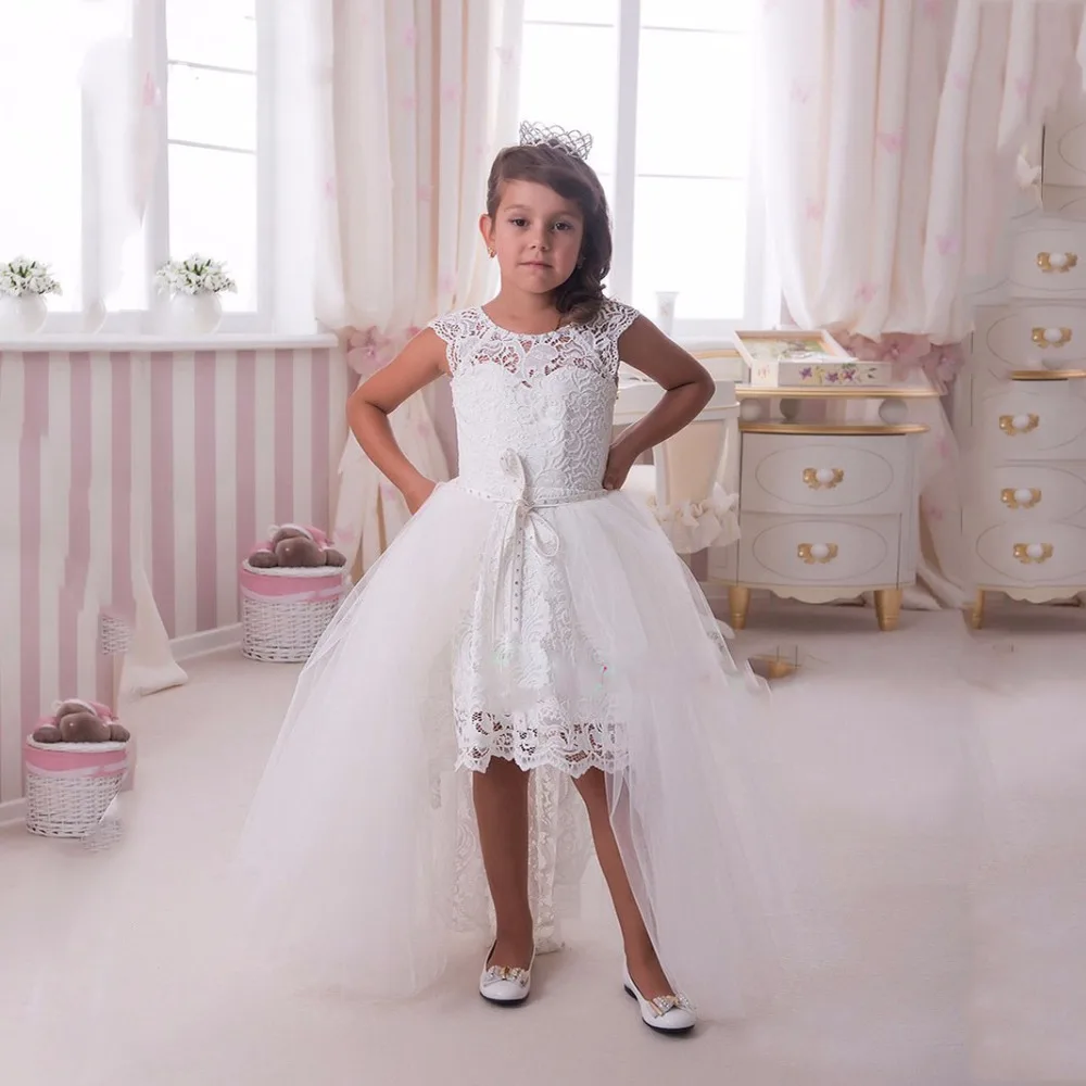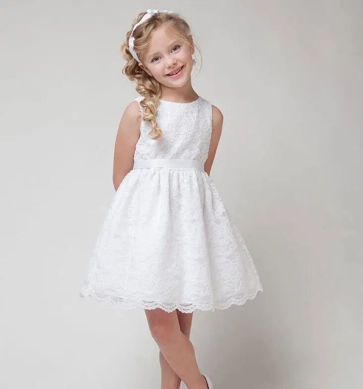 Дочка идет на выпускной в саду в коротком прямом кружевном белом платье.