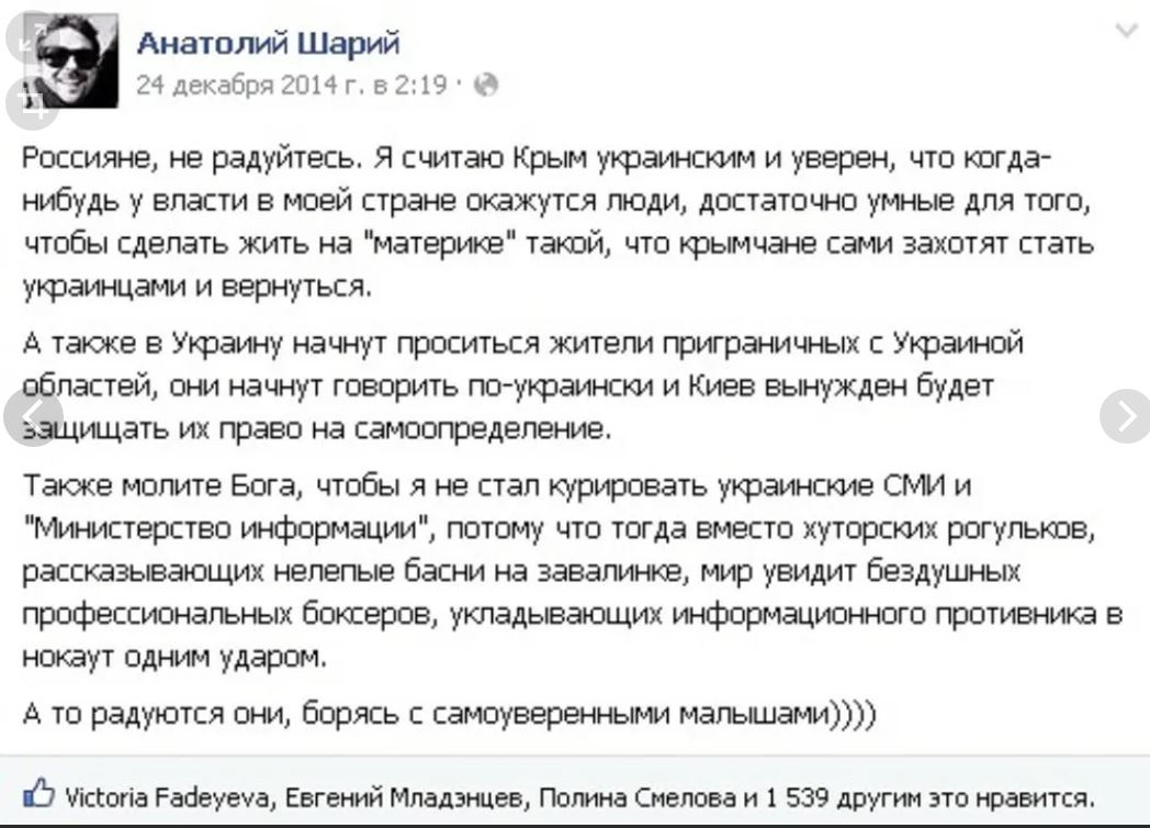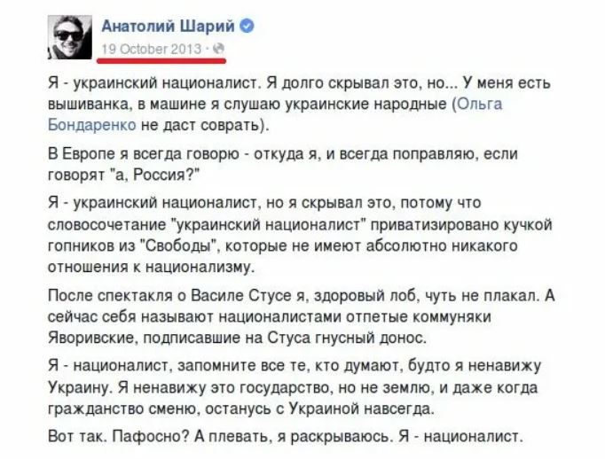 Он постил это. И на федеральных каналах его больше не будет. Свой дом за 400 млн он продает сейчас с дисконтом, за 170 млн. Так что он рвет всё. Теперь его удел это чёс по концертам в каких-нибудь местных ДК в евроколхозе.