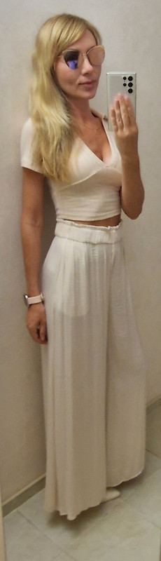 Синий с черным дурное сочетание. Не нужно так. Бретелька торчит, зачем нам видеть ваше нижнее белье. У брюк длина не для этой обуви и вообще все пропорции нарушены. Не годно все.