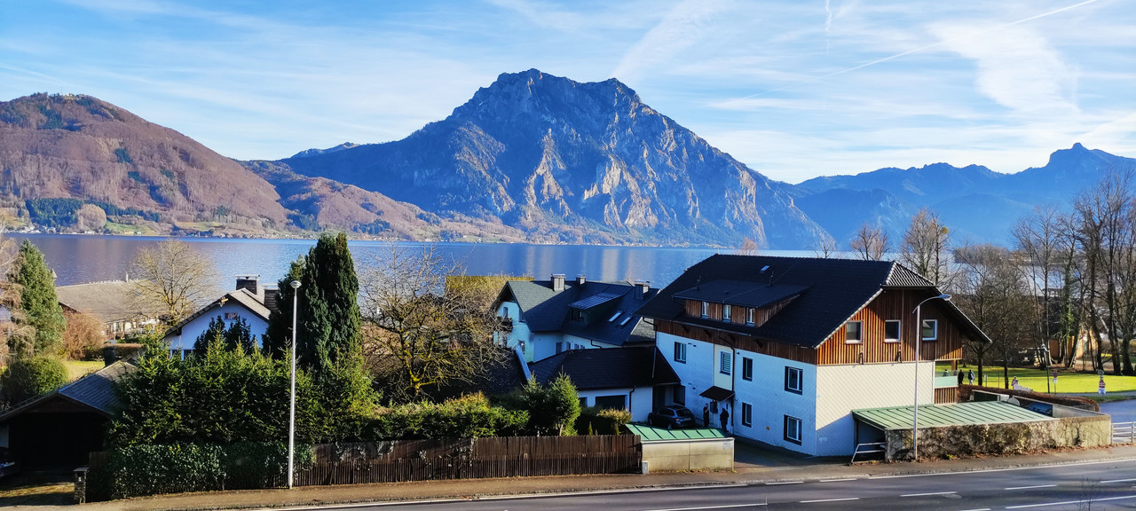 Это вид из окна на даче :) Но, правды ради, в ноябре и декабре мы, приезжая на выходные, даже водную поверхность толком не видели, не говоря уж про Траун, в этом году очень много туманов было