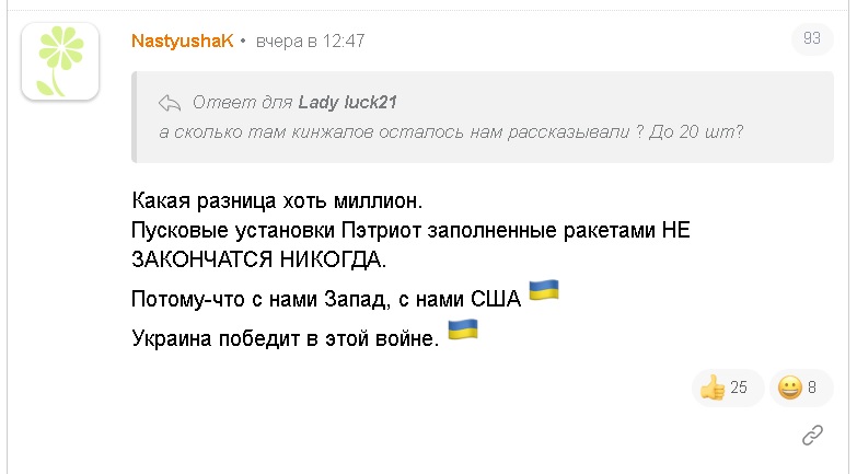 Наш источник в ОП рассказал, что удар по Patriot нанес сильный имиджевые издержки по американским ПВО и теперь нам могут отказать в F-16. На Банковой пытались сместить акцент и замять информацию о попадание кинжалами, но видео разлетелось по всему миру и никто не поверил в 6 сбитых сверхзвуковых ракет (пропаганда перестаралась). Сейчас идут консультации с Пентагоном как купировать негативную информационную волну и показать установки Patriot СМИ, американцы хотят всех убедить в том, что не вся батарея уничтожена, так как на видео было видно, что залп в 32 ракеты делали с одной позиции и не одна ракета не попала в кинжал.