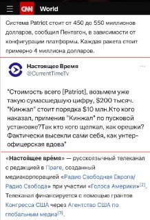 Американские СМИ продолжают негодовать по поводу ЗРК Patriot в Киеве, который сначала выпустил в небо 32 ракеты на $96-128 млн (стоимость ракеты $3-4 млн), а потом словил «Кинжал» в РЛС и пусковые установки. По данным CNN одна система Patriot стоит $450–550 млн.