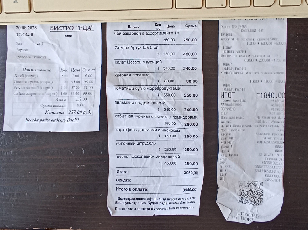 Ну вот для примера 3 чека: левый из обычной столовки (я обедала одна), средний из достаточно дорогого ресторана (счёт на четверых взрослых), правый из обычного кафе (это на двоих).