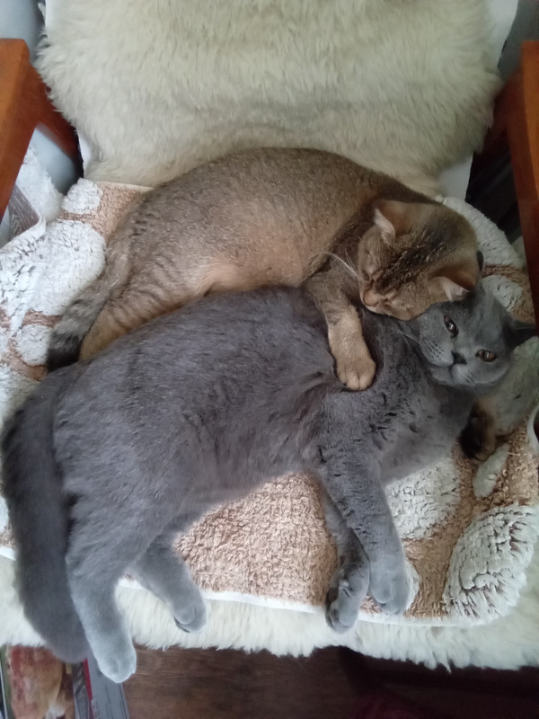 Они прямо очень сдружились с Кортезиком (младшим). Старший смотрит на нее, как на что-то странное)) Хотя в догонялки носятся втроем)) и эта мелкая кошь может напасть на старшего... Только в старшем - 8 кг, а в этой - 3)