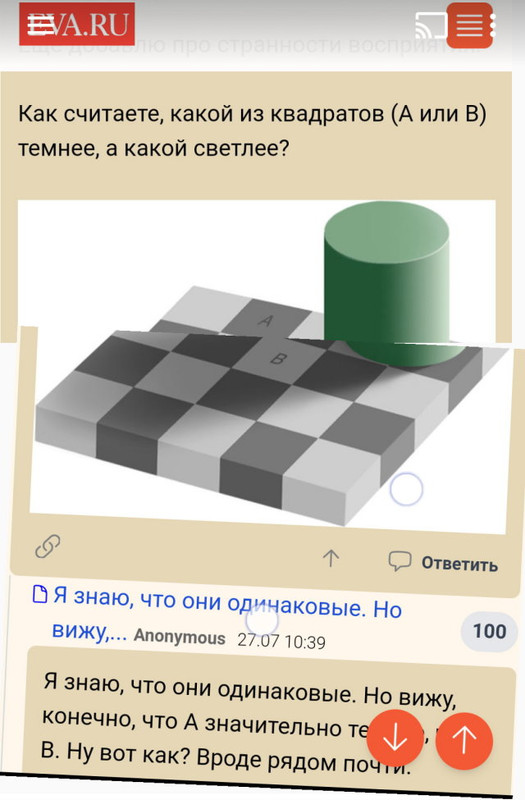Вижу, что А темнее. А почему бы А не быть темнее В, если это шахматная доска? Или это не шахматная доска и вообще все квадраты одного цвета?