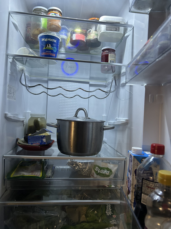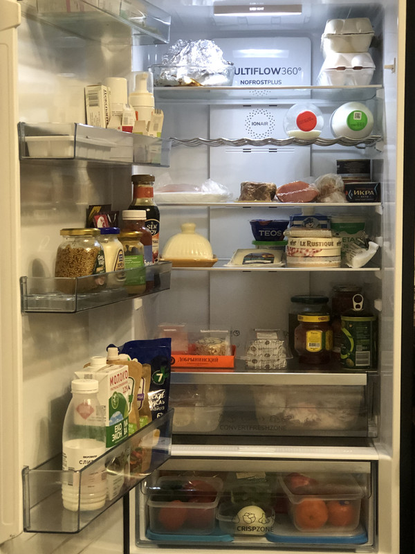 Сейчас средней забитости. В холодильнике миска с котлетами, нажаренными сегодня, часть съели, на завтра еще осталось. Салат свежий в горшочке, помидоры, огурцы, морковь, сельдерей, яблоки, хурма, авокадо, петрушка в горшочке. Яйца 12шт, 2 литра молока, 2 литра яблочного сока, 1 литр клюквенного морса, пачка сливочного масла, сыр пармезан и легкий Брест-литовский по пачке. Банки: горошек, кукуруза, фасоль, оливки, маслины, пассата 2 шт, банка протертой смородины, баночка имбирного джема, лечо с лисичками, банка маслят маринованных, аджап-сандал, банка вяленых помидоров. 2 банки сметаны разной жирности, 2 пачки сливок для пасты, ну всякие хрен, горчица, паста томатная, кетчуп, соевый соус, куча соусов всяких еще, шт7-9 в двери, включая какой-то с Канар, стоит сто лет, надо выбросить, Банка с рикоттой и пачка горбуши слабосоленой для бутеров.